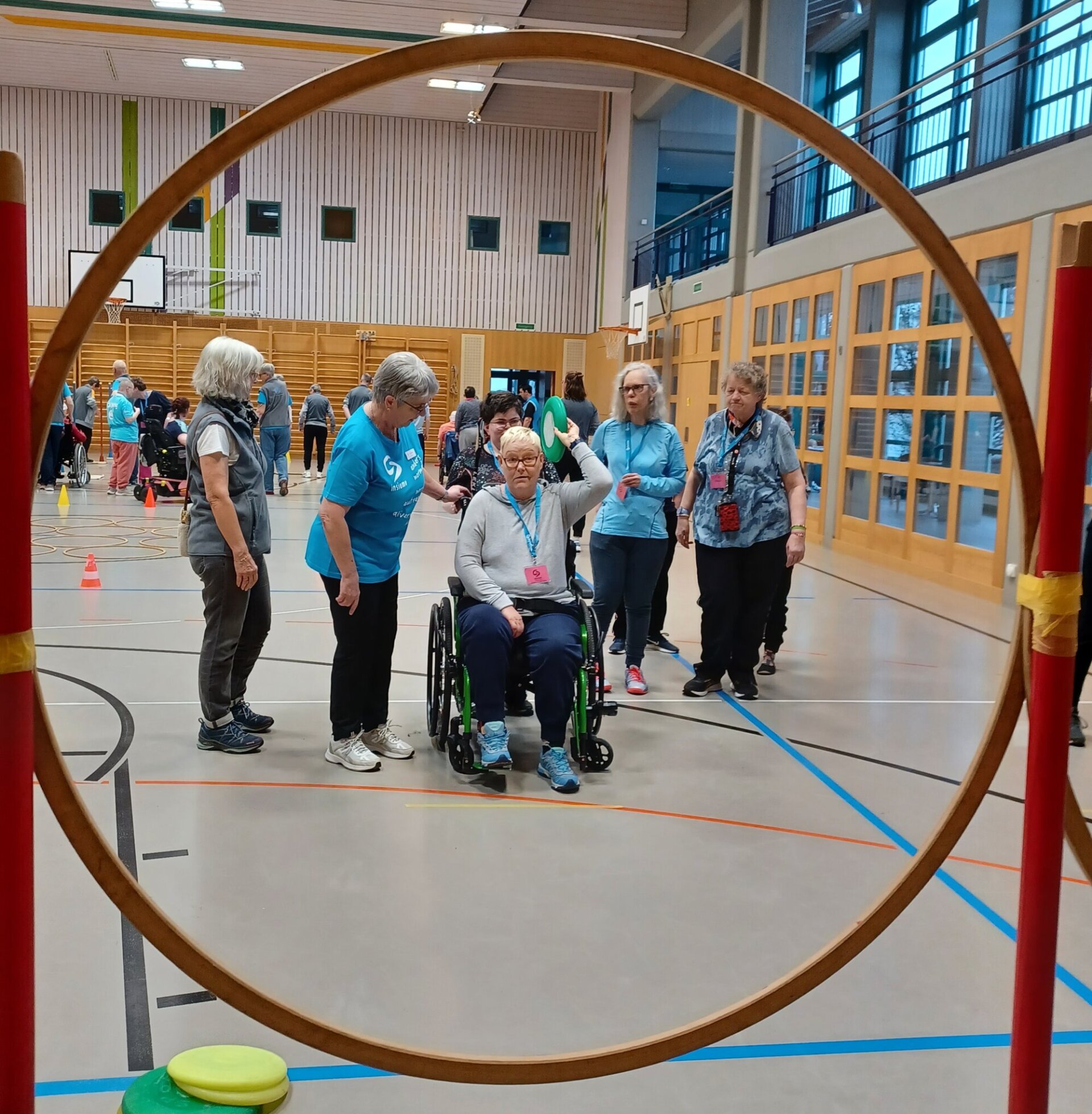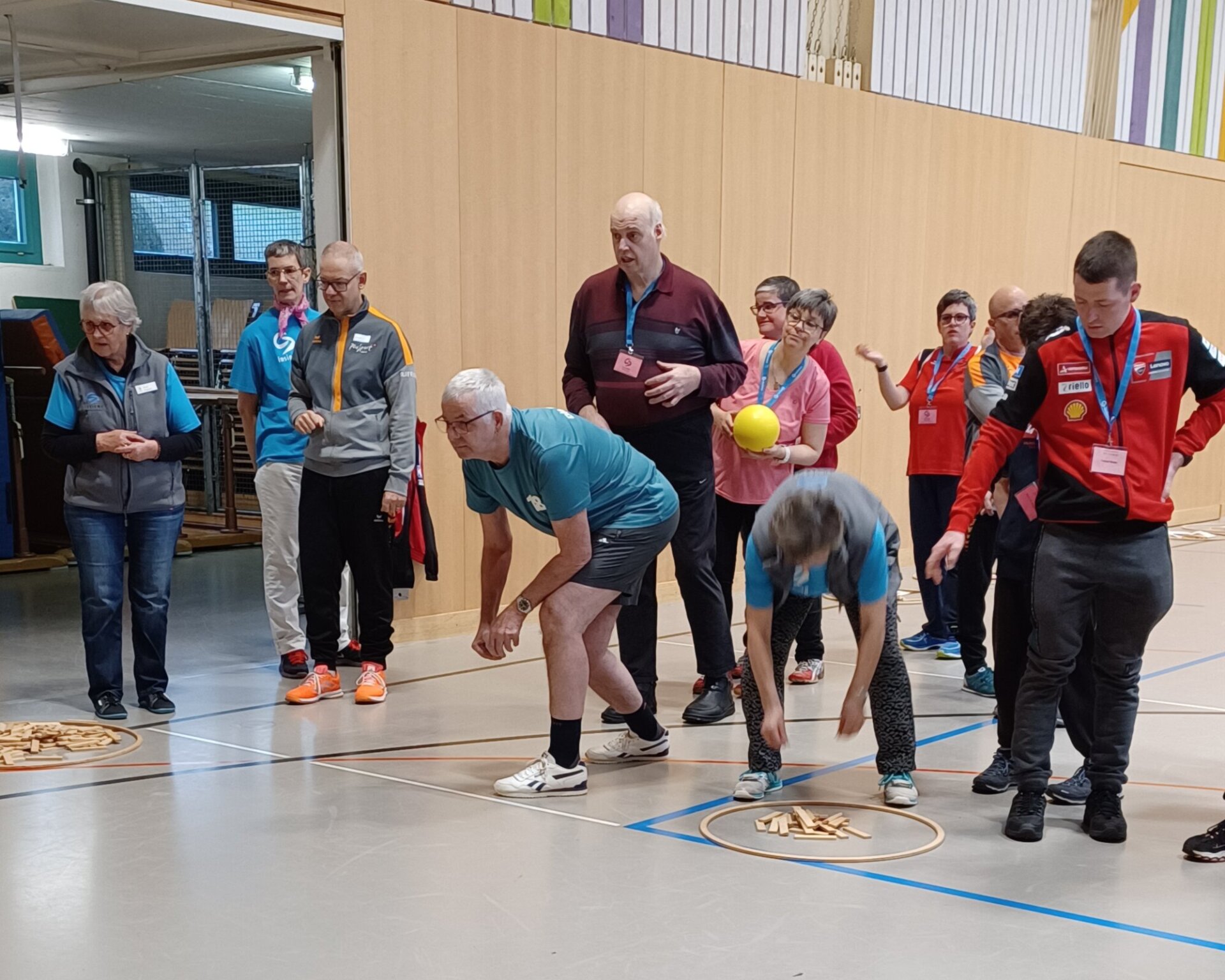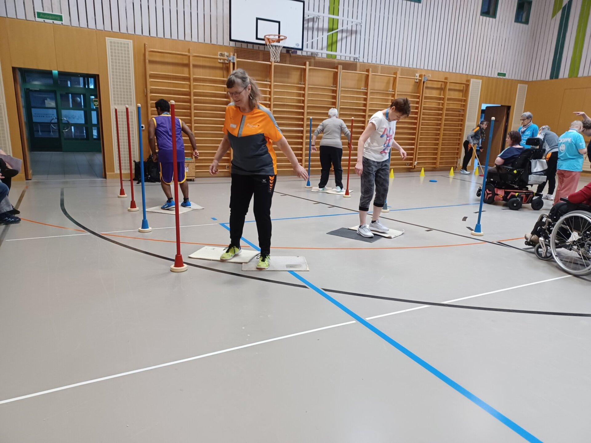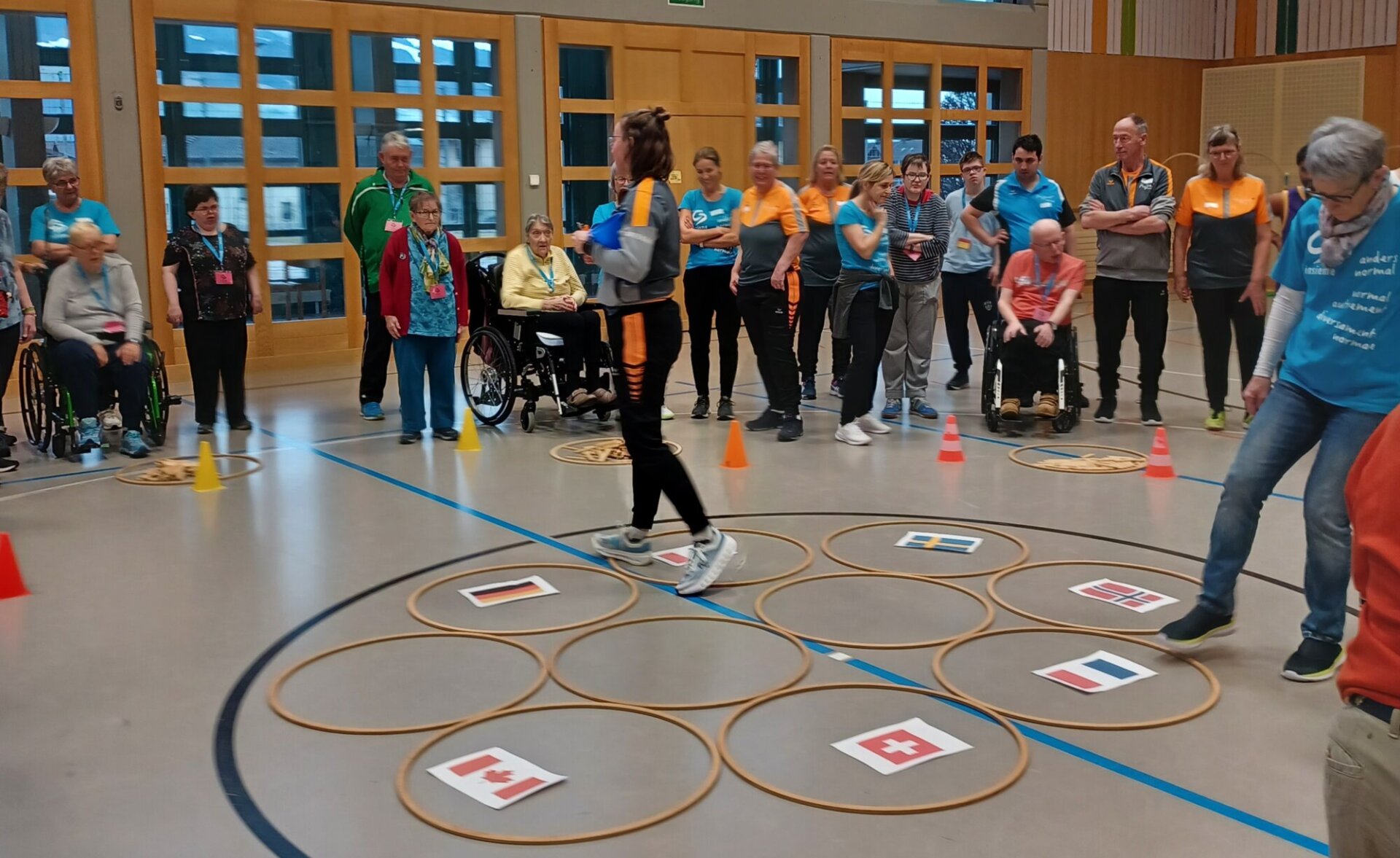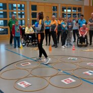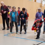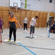 Pünktlich um 13.30 Uhr rollte der Car auf den Schulhausplatz in Wangen. Genau in diesem Moment öffnete Petrus sämtliche Schleusen, aber unsere echten Sportler und Sportlerinnen liessen sich von den Regentropfen nicht beeinflussen und marschierten zielstrebig in die Turnhalle. Nach der Gruppeneinteilung nahmen die Betreuungspersonen unsere Gäste herzlich in Empfang. Anne-Kathrin erklärte das Nachmittagsprogramm und kurz darauf begann das gemeinsame Einwärmen und die grosse Olympiade konnte gestartet werden.