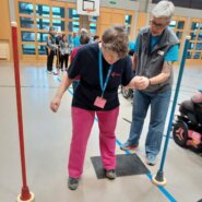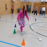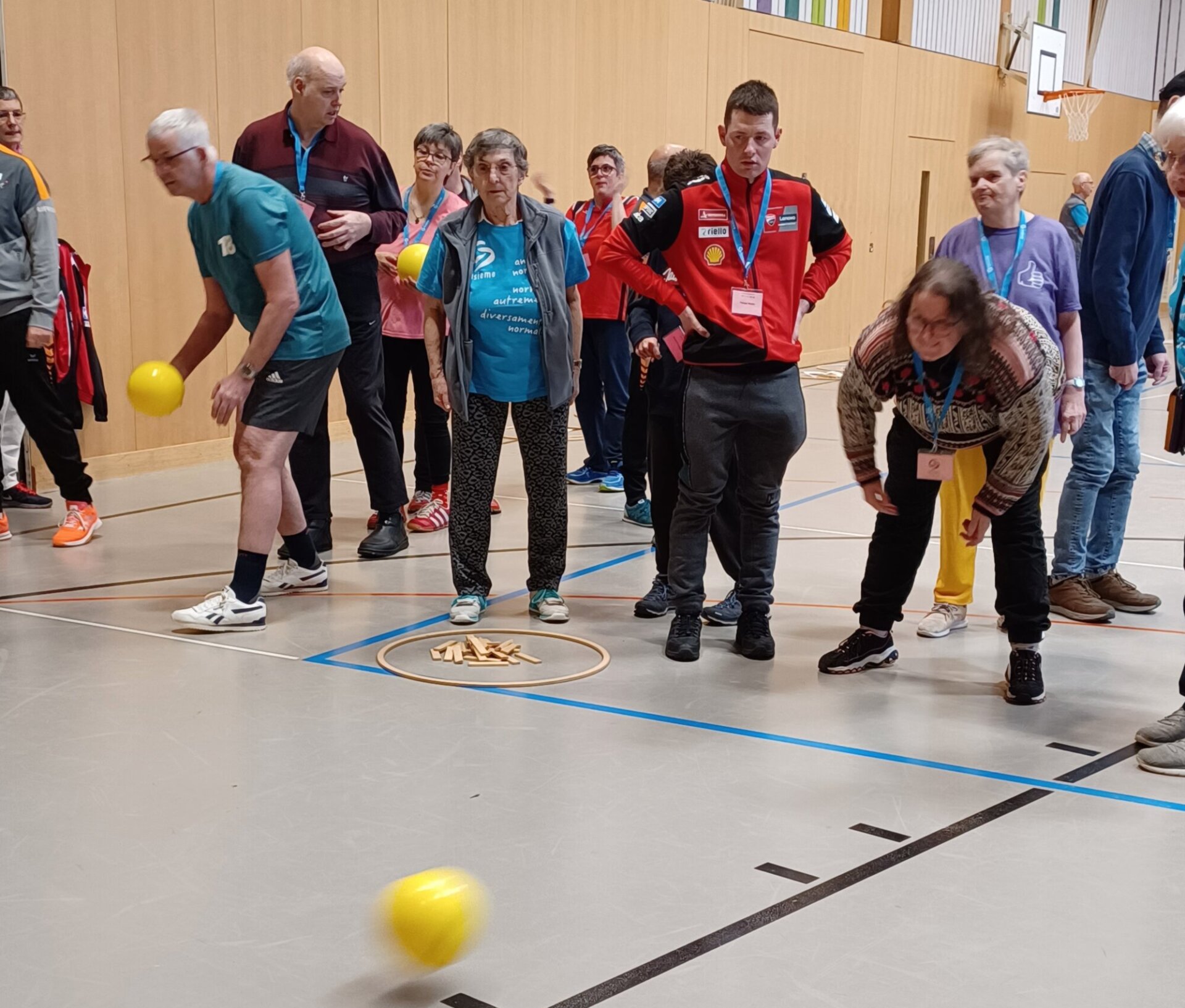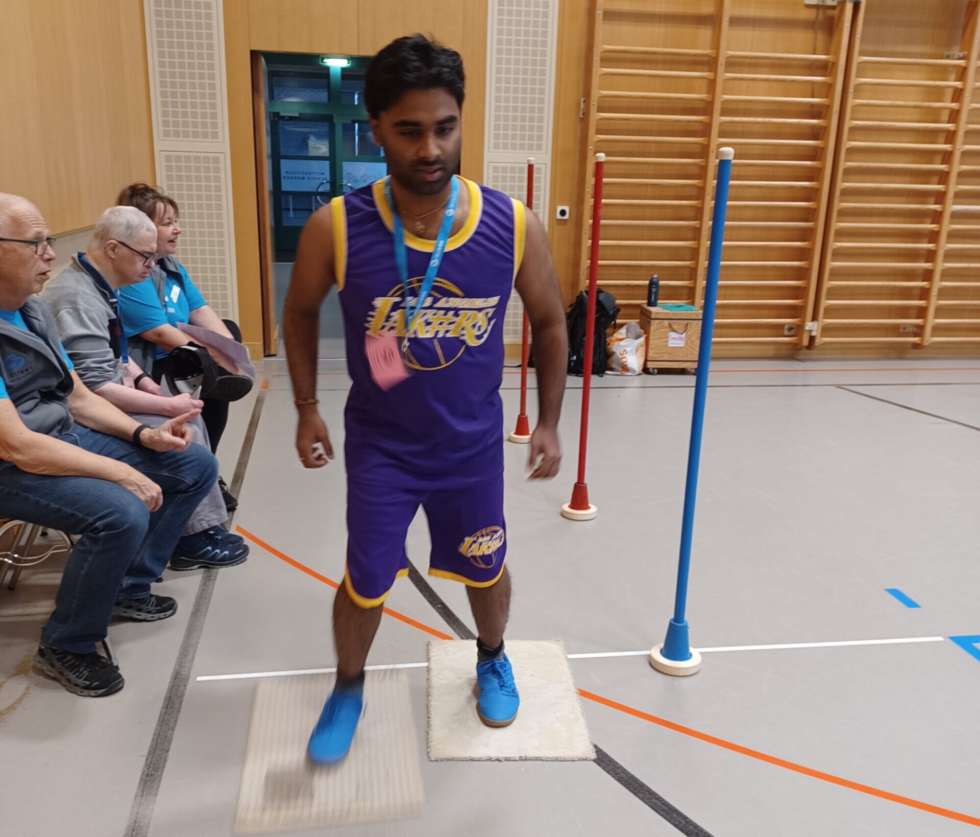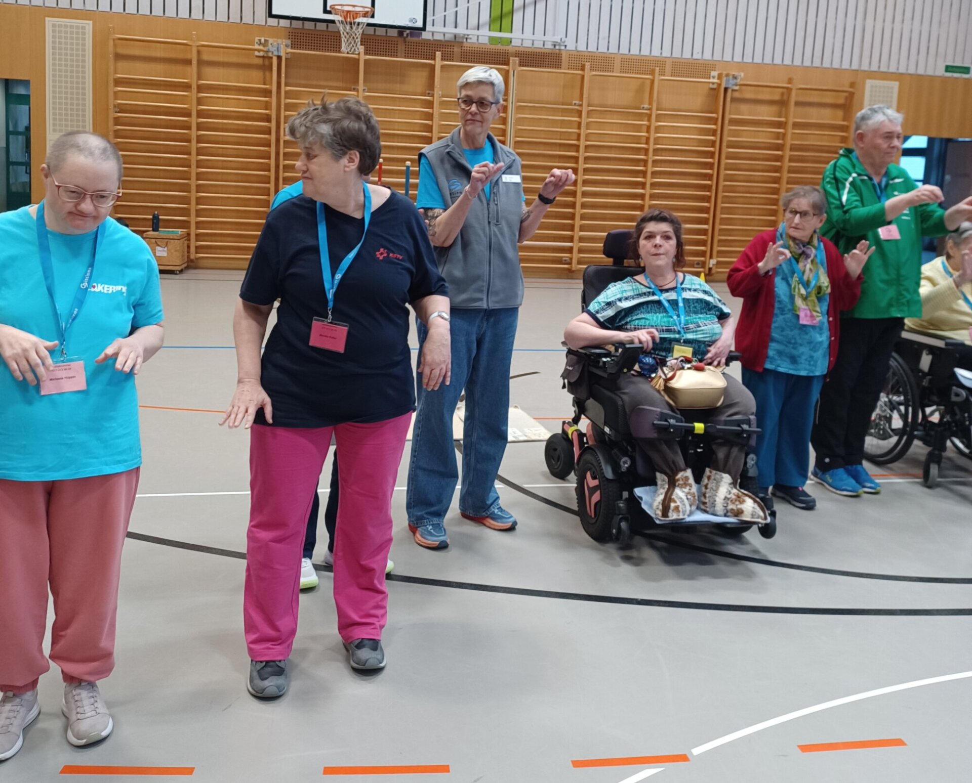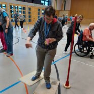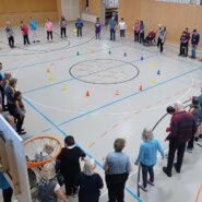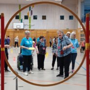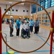 Pünktlich um 13.30 Uhr rollte der Car auf den Schulhausplatz in Wangen. Genau in diesem Moment öffnete Petrus sämtliche Schleusen, aber unsere echten Sportler und Sportlerinnen liessen sich von den Regentropfen nicht beeinflussen und marschierten zielstrebig in die Turnhalle. Nach der Gruppeneinteilung nahmen die Betreuungspersonen unsere Gäste herzlich in Empfang. Anne-Kathrin erklärte das Nachmittagsprogramm und kurz darauf begann das gemeinsame Einwärmen und die grosse Olympiade konnte gestartet werden.