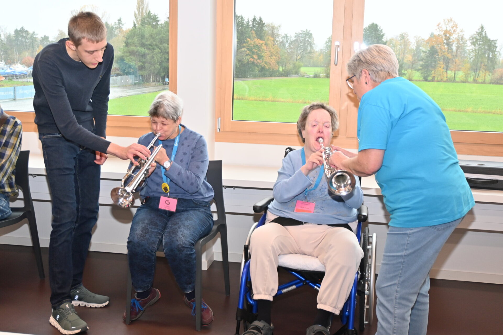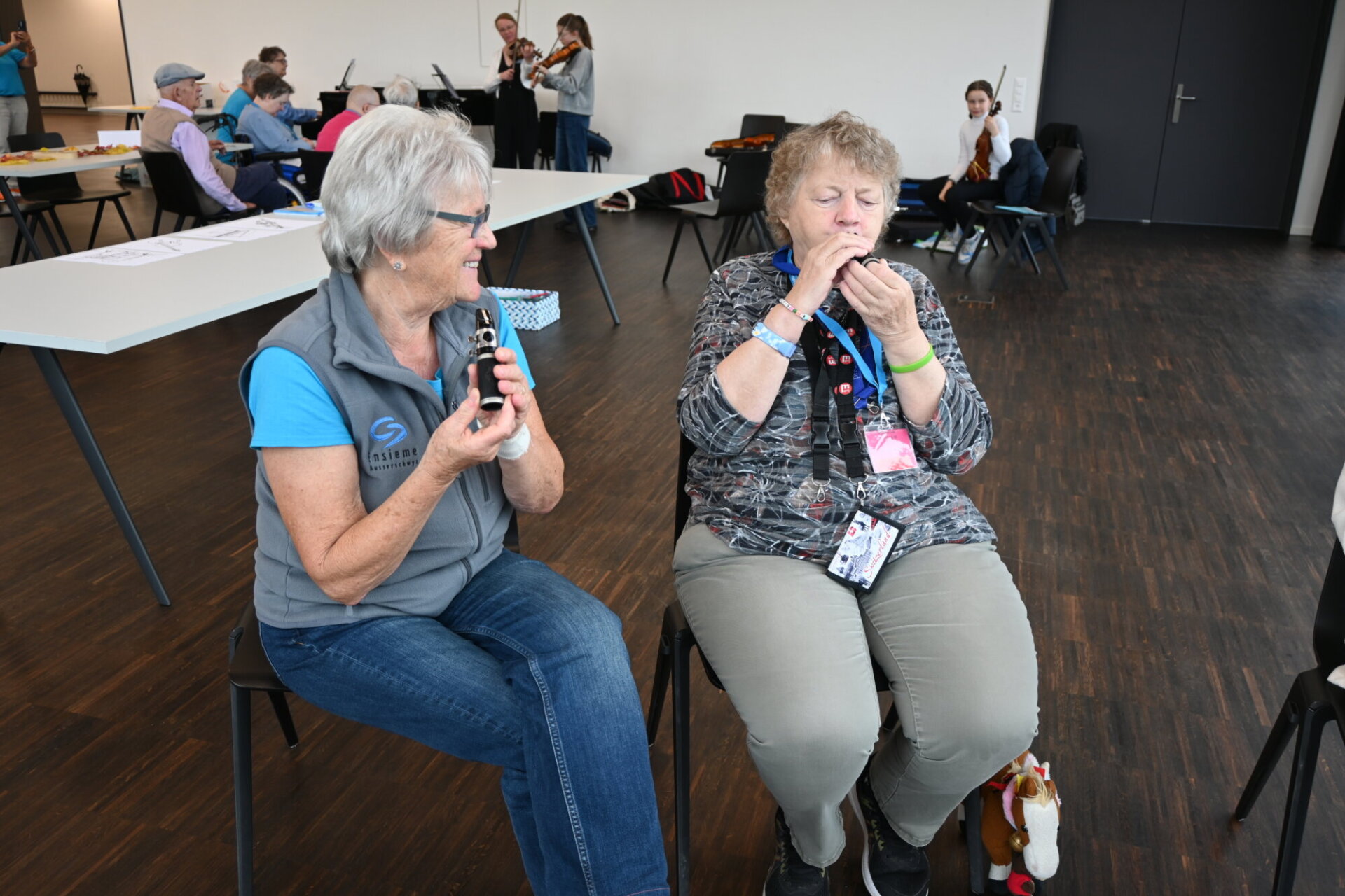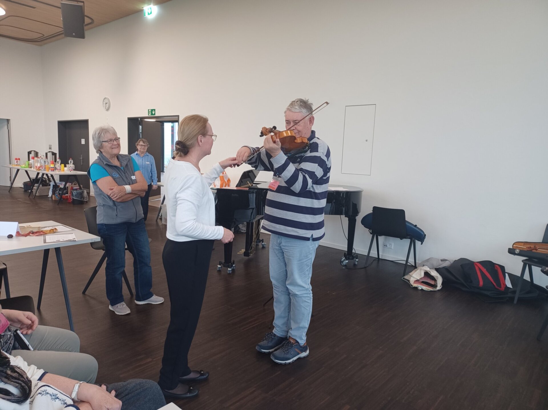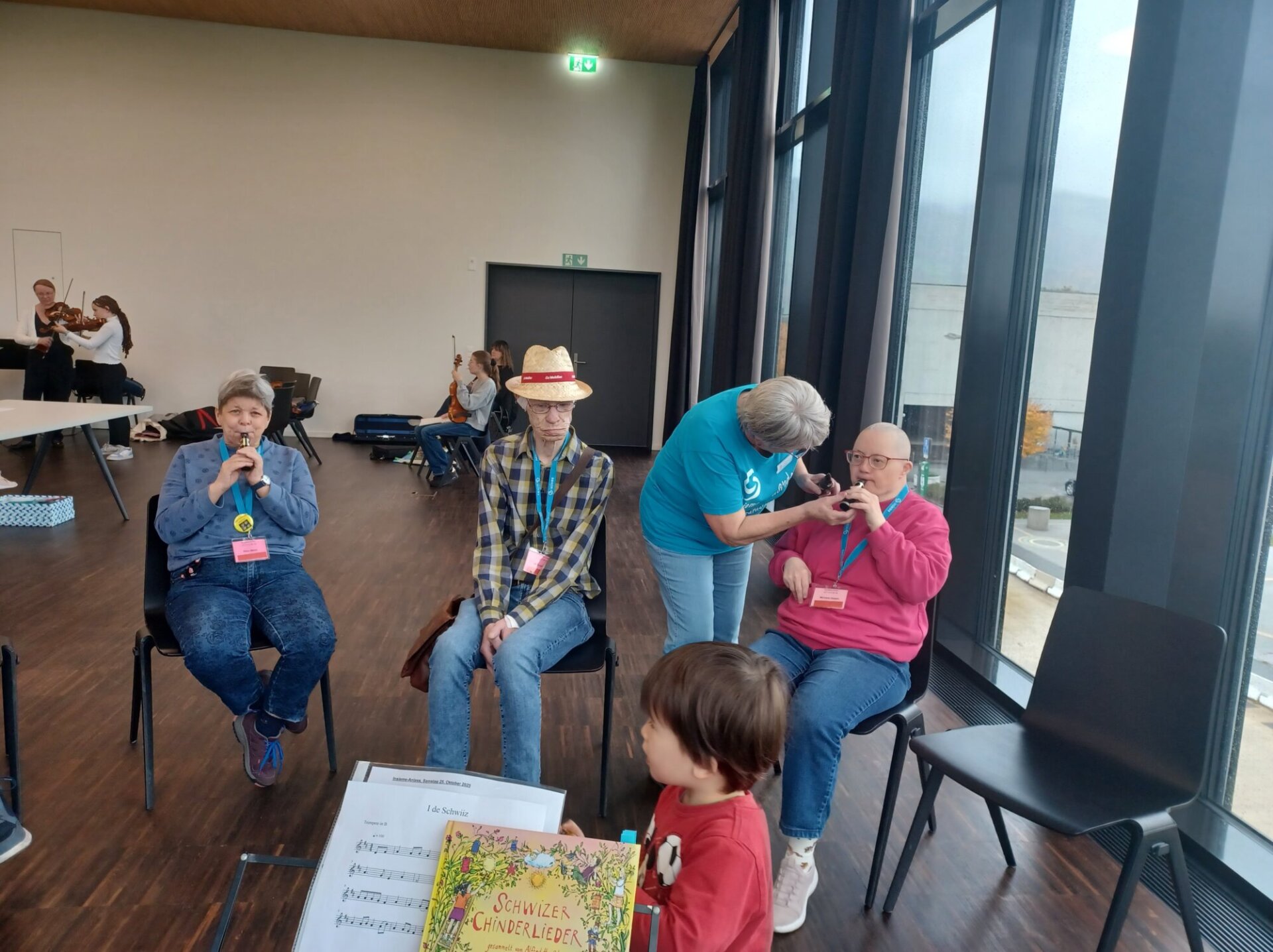 Katalin Müller, Schulleiterin der Musik- und Kunstschule, begrüsste die bunte Schar und freute sich auf einen unvergesslichen Nachmittag. Eingeteilt in vier Gruppen durchliefen die 31 Teilnehmenden verschiedene Posten. Während sie in einem Raum Geige spielen konnten, durften sie in einem anderen in die Trompete pusten. Eine Lehrperson war ebenfalls vor Ort, um den Gästen das Klarinettenspielen näherzubringen. Im Erdgeschoss warteten diverse Perkussionsinstrumente auf die Gruppe und es wurde ein afrikanisches Lied gesungen und getanzt. Wer schon immer einmal in einem Theater mitspielen wollte, der kam an diesem Nachmittag ebenfalls auf seine Kosten. Egal, welchen Raum man betrat, die fröhliche Stimmung war überall deutlich spürbar.