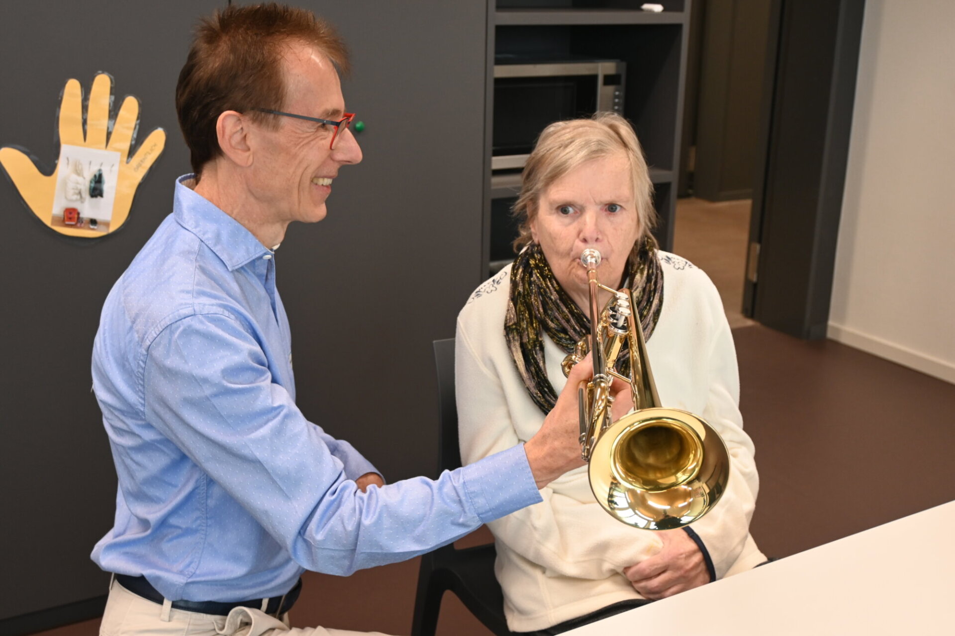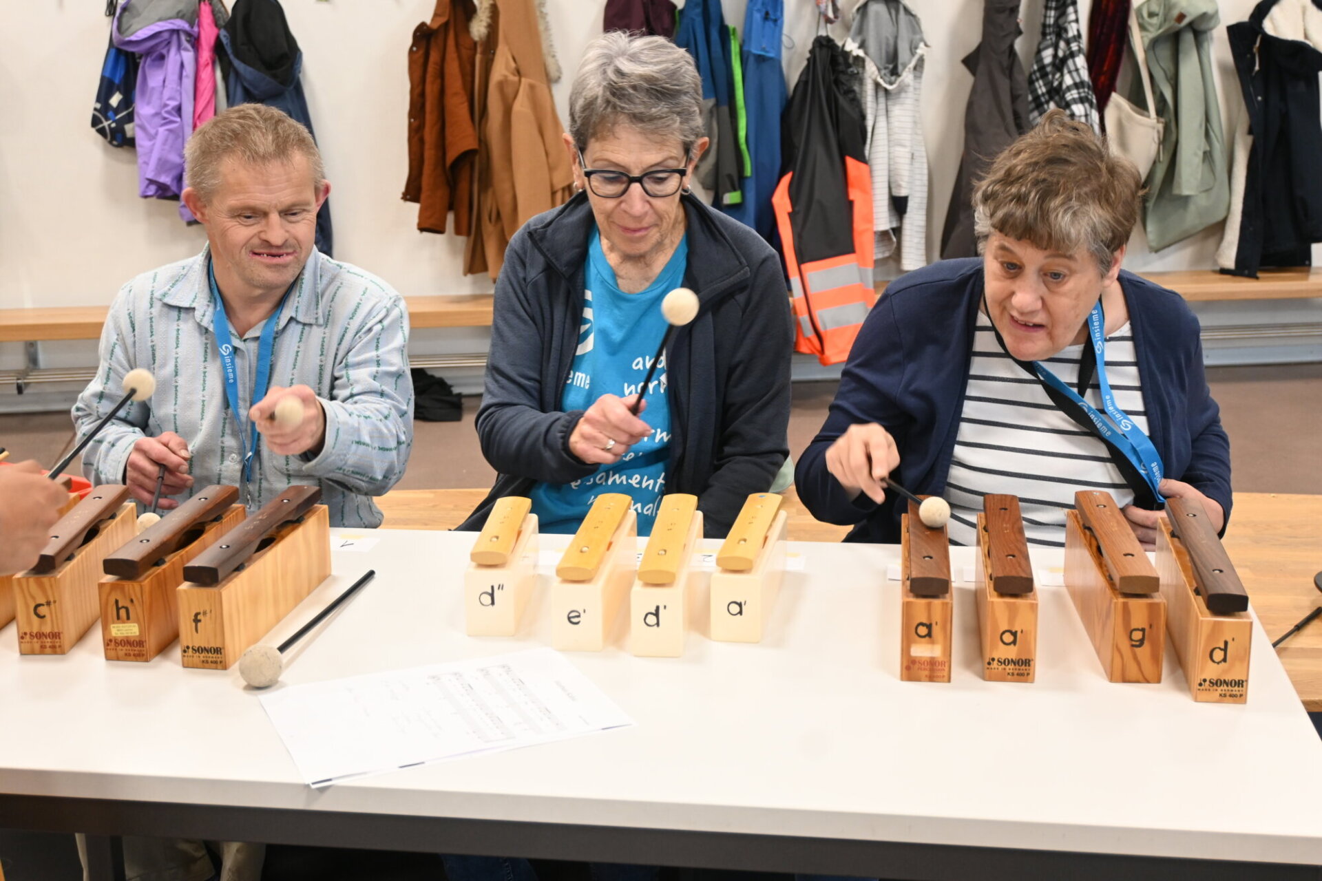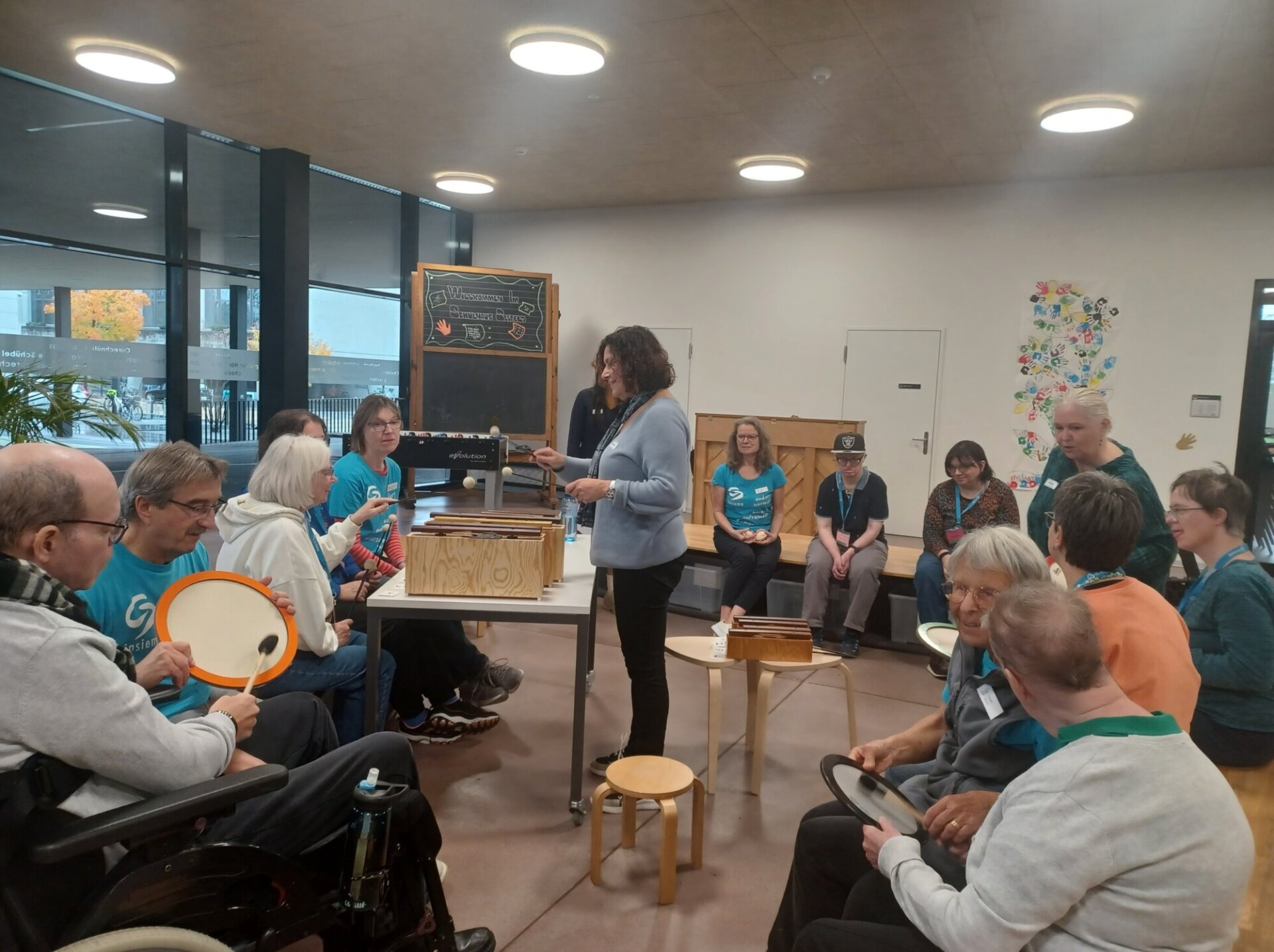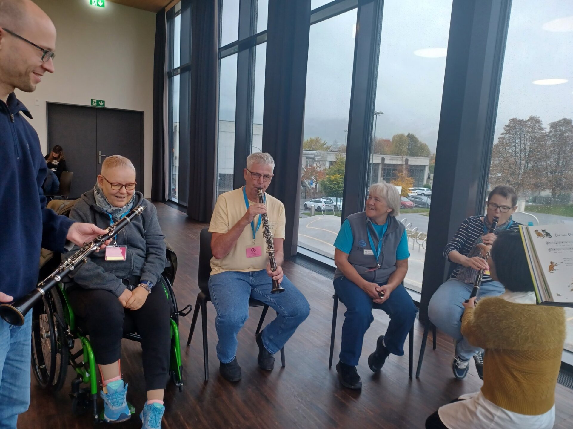Katalin Müller, Schulleiterin der Musik- und Kunstschule, begrüsste die bunte Schar und freute sich auf einen unvergesslichen Nachmittag. Eingeteilt in vier Gruppen durchliefen die 31 Teilnehmenden verschiedene Posten. Während sie in einem Raum Geige spielen konnten, durften sie in einem anderen in die Trompete pusten. Eine Lehrperson war ebenfalls vor Ort, um den Gästen das Klarinettenspielen näherzubringen. Im Erdgeschoss warteten diverse Perkussionsinstrumente auf die Gruppe und es wurde ein afrikanisches Lied gesungen und getanzt. Wer schon immer einmal in einem Theater mitspielen wollte, der kam an diesem Nachmittag ebenfalls auf seine Kosten. Egal, welchen Raum man betrat, die fröhliche Stimmung war überall deutlich spürbar.