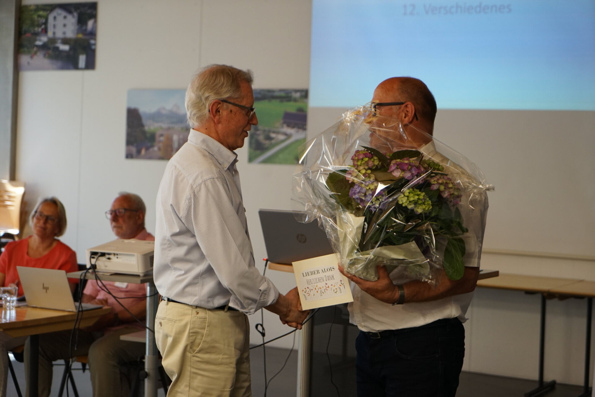 Zum Schluss wurde den beiden Vorstandsmitglieder Alois Hauser und Beat Abegg für ihre grossen Verdienste von Herzen gedankt und Beat Abegg die Ehrenmitgliedschaft verliehen. Beide werden noch bis zum Jubiläum tatkräftig im OK mitarbeiten. Nach den Schlussworten spielte das Trio ÖRGELER WEBSTEI wunderbare Klänge zum Zvieri und setzte somit den perfekten Schlusspunkt unter die gelungene und fröhliche Vereinsversammlung 2026.